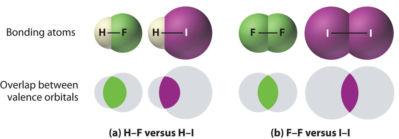 1. Bonds between hydrogen and atoms in the same column of the periodic table decrease in strength as we go down the column. Thus an H–F bond is stronger than an H–I bond, H–C is stronger than H–Si, H–N is stronger than H–P, H–O is stronger than H–S, and so forth. The reason for this is that the region of space in which electrons are shared between two atoms becomes proportionally smaller as one of the atoms becomes larger (part (a) in Figure 8.11 "The Strength of Covalent Bonds Depends on the Overlap between the Valence Orbitals of the Bonded Atoms").