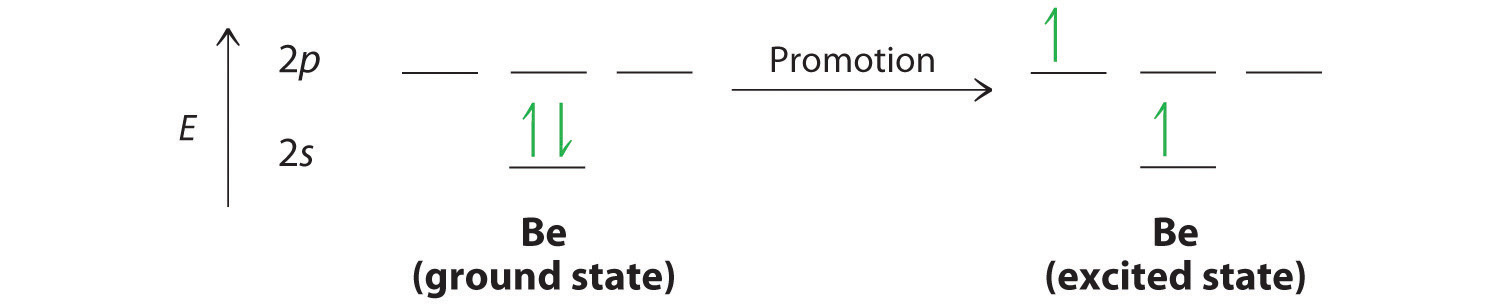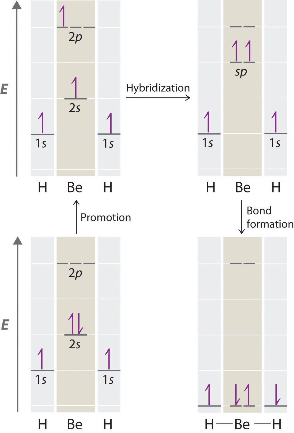 Let’s examine the bonds in BeH2, for example. According to the VSEPR model, BeH2 is a linear compound with four valence electrons and two Be–H bonds. Its bonding can also be described using an atomic orbital approach. Beryllium has a 1s22s2 electron configuration, and each H atom has a 1s1 electron configuration. Because the Be atom has a filled 2s subshell, however, it has no singly occupied orbitals available to overlap with the singly occupied 1s orbitals on the H atoms. If a singly occupied 1s orbital on hydrogen were to overlap with a filled 2s orbital on beryllium, the resulting bonding orbital would contain three electrons, but the maximum allowed by quantum mechanics is two. How then is beryllium able to bond to two hydrogen atoms? One way would be to add enough energy to excite one of its 2s electrons into an empty 2p orbital and reverse its spin, in a process called promotionThe excitation of an electron from a filled atomic orbital to an empty or valence orbital.: