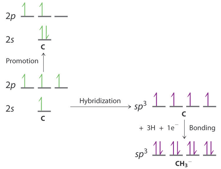 The promotion and hybridization process is exactly the same as shown for CH4 in the chapter. The only difference is that the C atom uses the four singly occupied sp3 hybrid orbitals to form electron-pair bonds with only three H atoms, and an electron is added to the fourth hybrid orbital to give a charge of 1–. The electron-pair geometry is tetrahedral, but the molecular geometry is pyramidal, as in NH3.