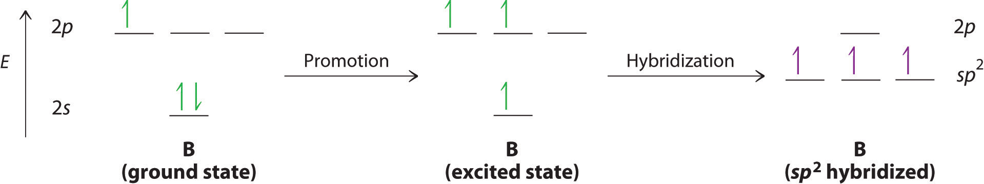 The concept of hybridization also explains why boron, with a 2s22p1 valence electron configuration, forms three bonds with fluorine to produce BF3, as predicted by the Lewis and VSEPR approaches. With only a single unpaired electron in its ground state, boron should form only a single covalent bond. By the promotion of one of its 2s electrons to an unoccupied 2p orbital, however, followed by the hybridization of the three singly occupied orbitals (the 2s and two 2p orbitals), boron acquires a set of three equivalent hybrid orbitals with one electron each, as shown here: