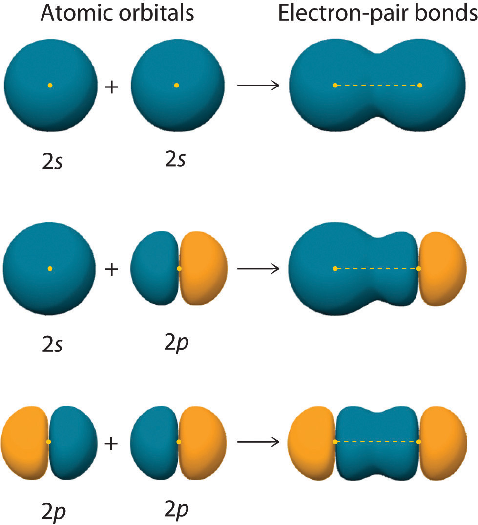 An electron-pair bond can be formed by the overlap of any of the following combinations of two singly occupied atomic orbitals: two ns atomic orbitals (a), an ns and an np atomic orbital (b), and two np atomic orbitals (c) where n = 2. The positive lobe is indicated in yellow, and the negative lobe is in blue.