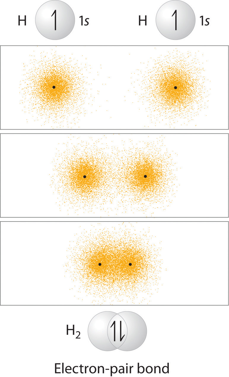 The formation of H2 from two hydrogen atoms, each with a single electron in a 1s orbital, occurs as the electrons are shared to form an electron-pair bond, as indicated schematically by the gray spheres and black arrows. The orange electron density distributions show that the formation of an H2 molecule increases the electron density in the region between the two positively charged nuclei.