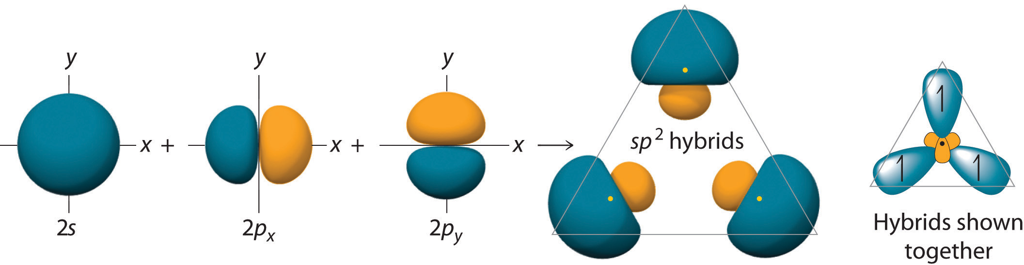 Combining one ns and two np atomic orbitals gives three equivalent sp2 hybrid orbitals in a trigonal planar arrangement; that is, oriented at 120° to one another.