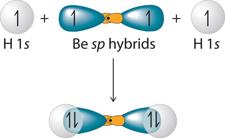 Each singly occupied sp hybrid orbital on beryllium can form an electron-pair bond with the singly occupied 1s orbital of a hydrogen atom. Because the two sp hybrid orbitals are oriented at a 180° angle, the BeH2 molecule is linear.