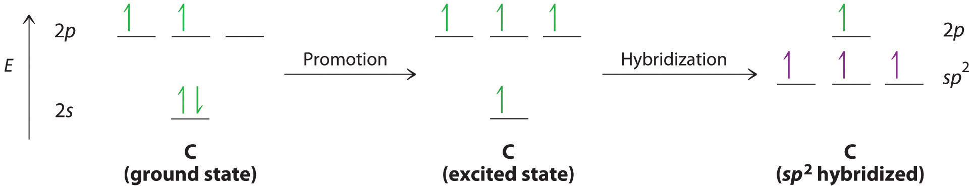 We begin our discussion by considering the bonding in ethylene (C2H4). Experimentally, we know that the H–C–H and H–C–C angles in ethylene are approximately 120°. This angle suggests that the carbon atoms are sp2 hybridized, which means that a singly occupied sp2 orbital on one carbon overlaps with a singly occupied s orbital on each H and a singly occupied sp2 lobe on the other C. Thus each carbon forms a set of three σ bonds: two C–H (sp2 + s) and one C–C (sp2 + sp2) (part (a) in Figure 9.32 "Bonding in Ethylene"). The sp2 hybridization can be represented as follows: