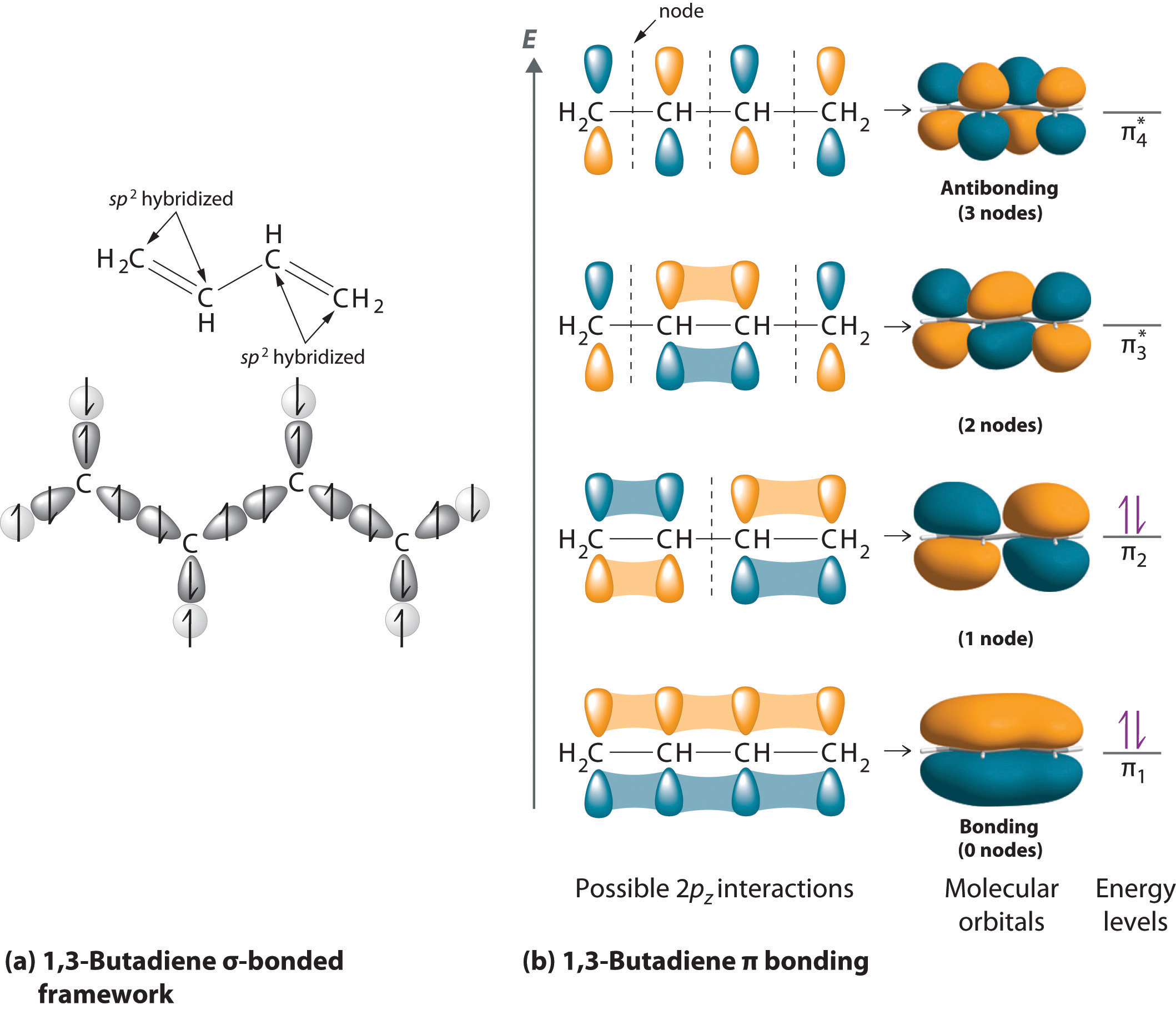 (a) If each carbon atom is assumed to be sp2 hybridized, we can construct a σ-bonded framework that accounts for the C–H and C–C single bonds, leaving four singly occupied 2pz orbitals, one on each carbon atom. (b) As in ozone, these orbitals can interact, in this case to form four molecular orbitals. The molecular orbital at lowest energy is a bonding orbital with 0 nodes, the one at highest energy is antibonding with 3 nodes, and the two in the middle have 1 node and 2 nodes and are somewhere between bonding or antibonding and nonbonding, respectively. The energy of the molecular orbital increases with the number of nodes. With four electrons, only the two bonding orbitals are filled, consistent with the presence of two π bonds.