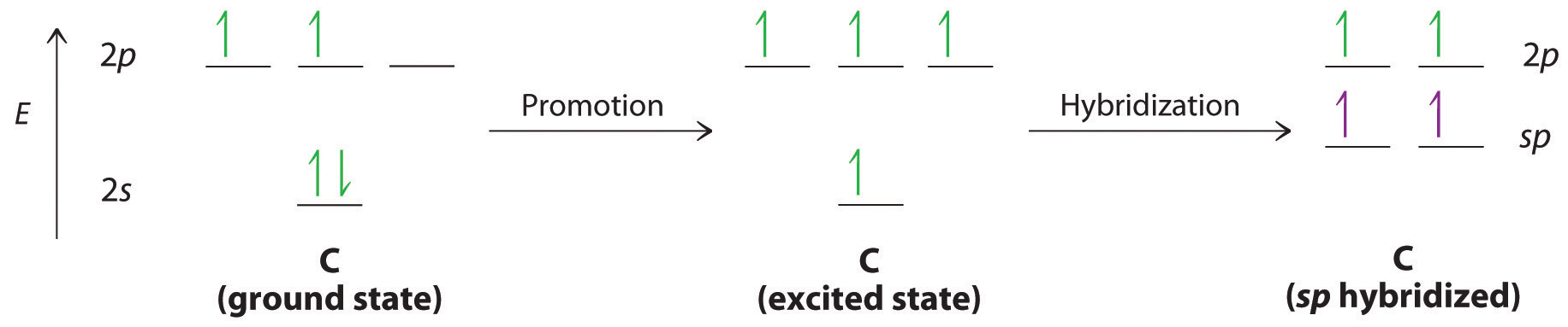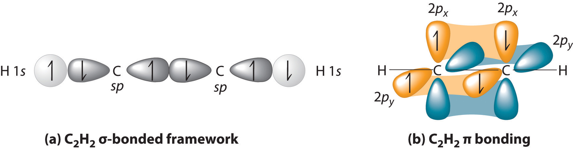(a) In the formation of the σ-bonded framework, two sets of singly occupied carbon sp hybrid orbitals and two singly occupied hydrogen 1s orbitals overlap. (b) In the formation of two carbon–carbon π bonds in acetylene, two singly occupied unhybridized 2px,y orbitals on each carbon atom overlap. With one σ bond plus two π bonds, the carbon–carbon bond order in acetylene is 3.