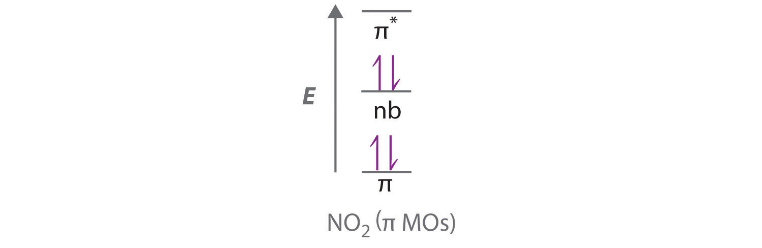 C Placing 4 electrons in the energy-level diagram fills both the bonding and nonbonding molecular orbitals and gives a π bond order of 1/2 per N–O bond. The overall N–O bond order is consistent with a resonance structure.