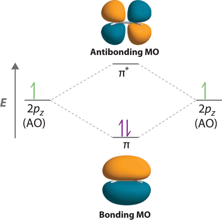 As in the diatomic molecules discussed previously, the singly occupied 2pz orbitals in ethylene can overlap to form a bonding/antibonding pair of π molecular orbitals. The two electrons remaining are enough to fill only the bonding π orbital. With one σ bond plus one π bond, the carbon–carbon bond order in ethylene is 2.