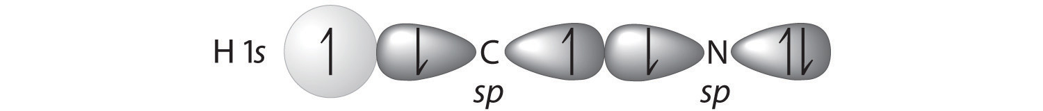 A Because HCN is a linear molecule, it is likely that the bonding can be described in terms of sp hybridization at carbon. Because the nitrogen atom can also be described as sp hybridized, we can use one sp hybrid on each atom to form a C–N σ bond. This leaves one sp hybrid on each atom to either bond to hydrogen (C) or hold a lone pair of electrons (N). Of 10 valence electrons (5 from N, 4 from C, and 1 from H), 4 are used for σ bonding: