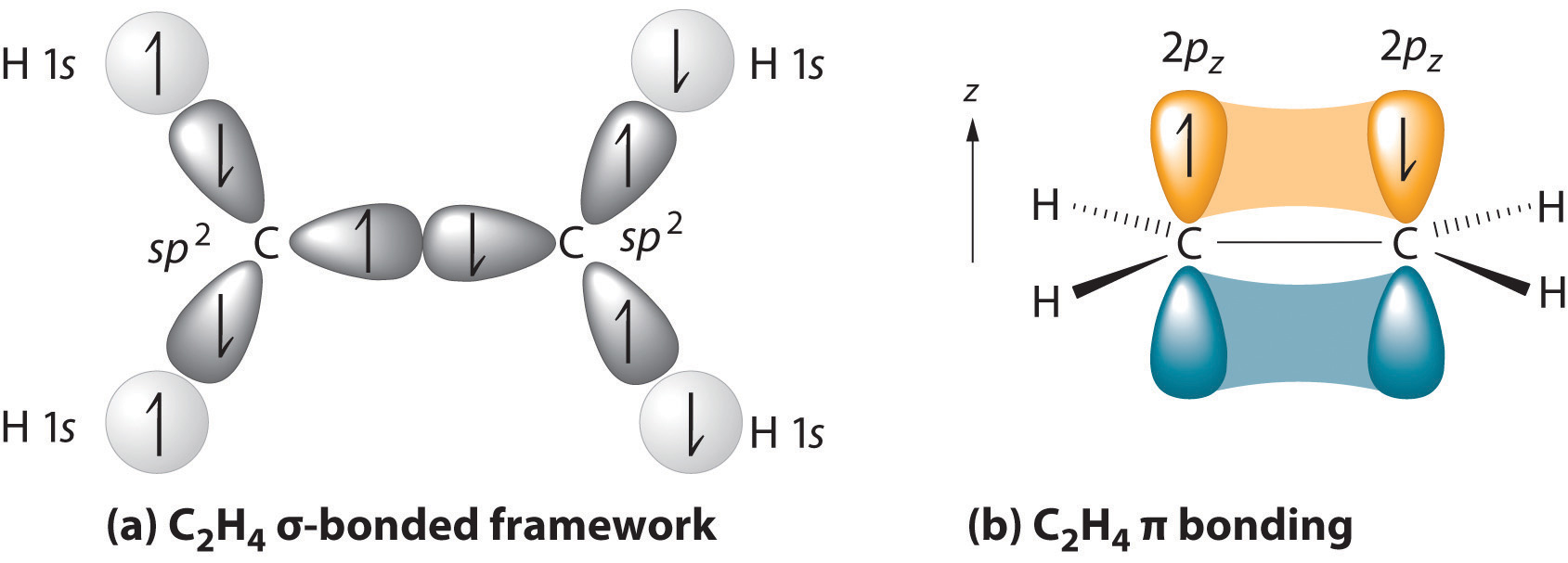 (a) The σ-bonded framework is formed by the overlap of two sets of singly occupied carbon sp2 hybrid orbitals and four singly occupied hydrogen 1s orbitals to form electron-pair bonds. This uses 10 of the 12 valence electrons to form a total of five σ bonds (four C–H bonds and one C–C bond). (b) One singly occupied unhybridized 2pz orbital remains on each carbon atom to form a carbon–carbon π bond. (Note: by convention, in planar molecules the axis perpendicular to the molecular plane is the z-axis.)