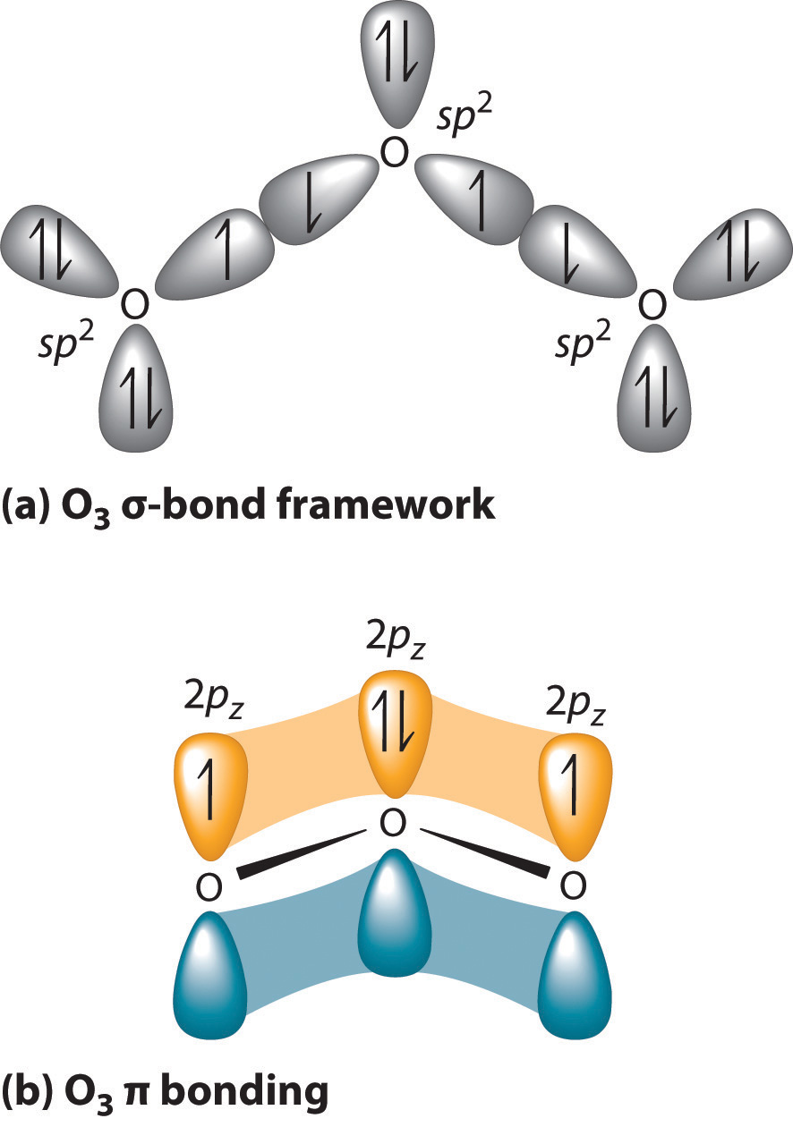 (a) In the formation of the σ-bonded framework, three sets of oxygen sp2 hybrid orbitals overlap to give two O–O σ bonds and five lone pairs, two on each terminal O and one on the central O. The σ bonds and lone pairs account for 14 of the 18 valence electrons of O3. (b) One unhybridized 2pz orbital remains on each oxygen atom that is available for π bonding. The unhybridized 2pz orbital on each terminal O atom has a single electron, whereas the unhybridized 2pz orbital on the central O atom has 2 electrons.
