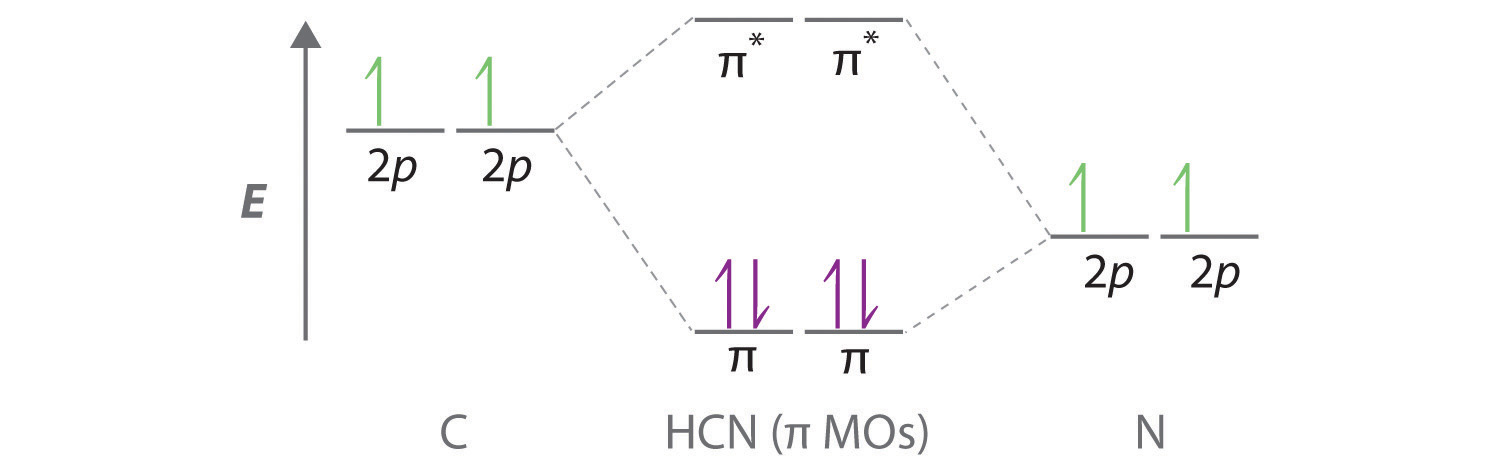 B We are now left with 2 electrons on N (5 valence electrons minus 1 bonding electron minus 2 electrons in the lone pair) and 2 electrons on C (4 valence electrons minus 2 bonding electrons). We have two unhybridized 2p atomic orbitals left on carbon and two on nitrogen, each occupied by a single electron. These four 2p atomic orbitals can be combined to give four molecular orbitals: two π (bonding) orbitals and two π* (antibonding) orbitals. C With 4 electrons available, only the π orbitals are filled. The overall result is a triple bond (1 σ and 2 π) between C and N.