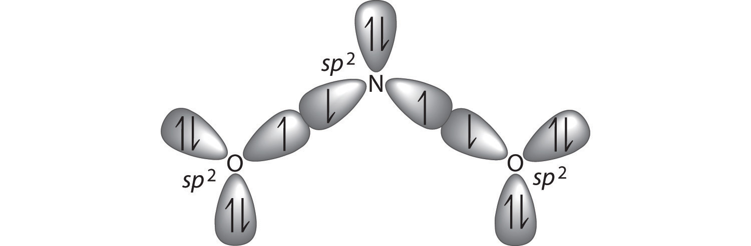 B If we assume that the oxygen atoms are sp2 hybridized as well, then we can use two sp2 hybrid orbitals on each oxygen and one sp2 hybrid orbital on nitrogen to accommodate the five lone pairs of electrons. Two sp2 hybrid orbitals on nitrogen form σ bonds with the remaining sp2 hybrid orbital on each oxygen. The σ bonds and lone pairs account for 14 electrons. We are left with three unhybridized 2p orbitals, one on each atom, perpendicular to the plane of the molecule, and 4 electrons. Just as with ozone, these three 2p orbitals interact to form bonding, nonbonding, and antibonding π molecular orbitals. The bonding molecular orbital is spread over the nitrogen and both oxygen atoms.