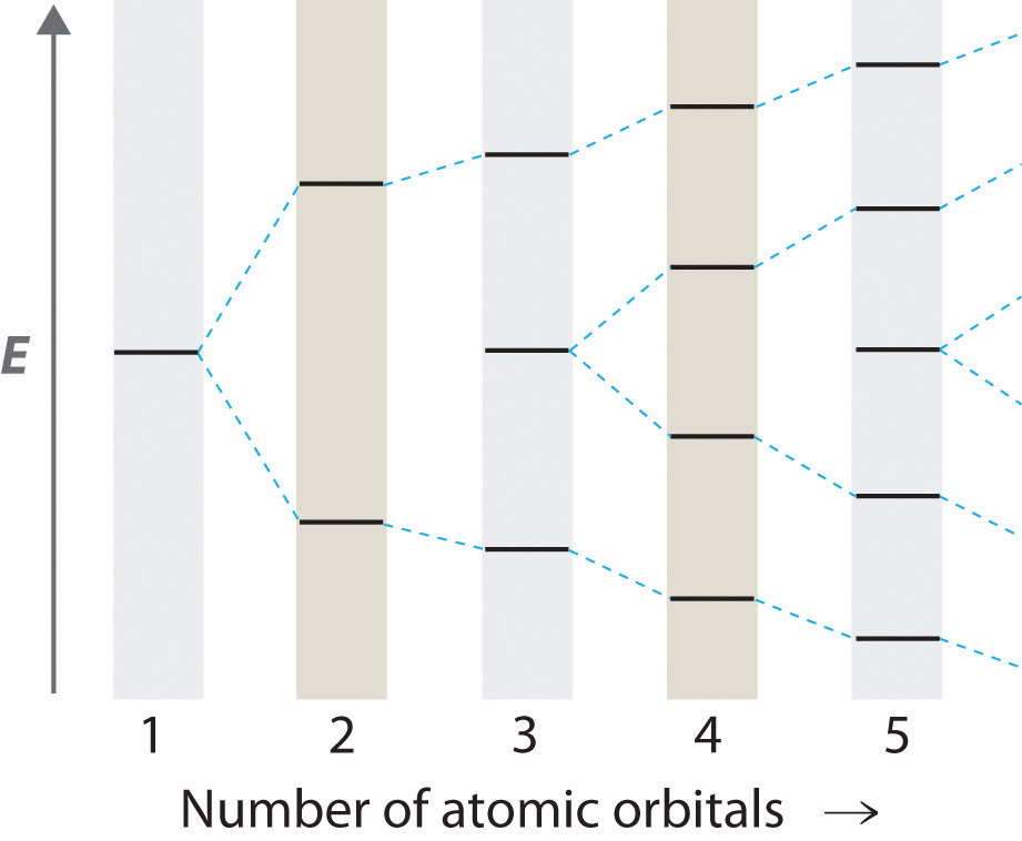 As the number of interacting atomic orbitals increases, the energy separation between the resulting molecular orbitals steadily decreases.