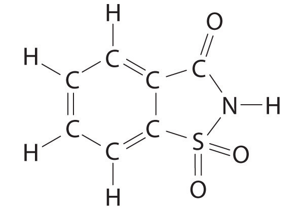 ♦ Saccharin is an artificial sweetener that was discovered in 1879. For several decades, it was used by people who had to limit their intake of sugar for medical reasons. Because it was implicated as a carcinogen in 1977, however, warning labels are now required on foods and beverages containing saccharin. The structure of this sweetener is as follows:
