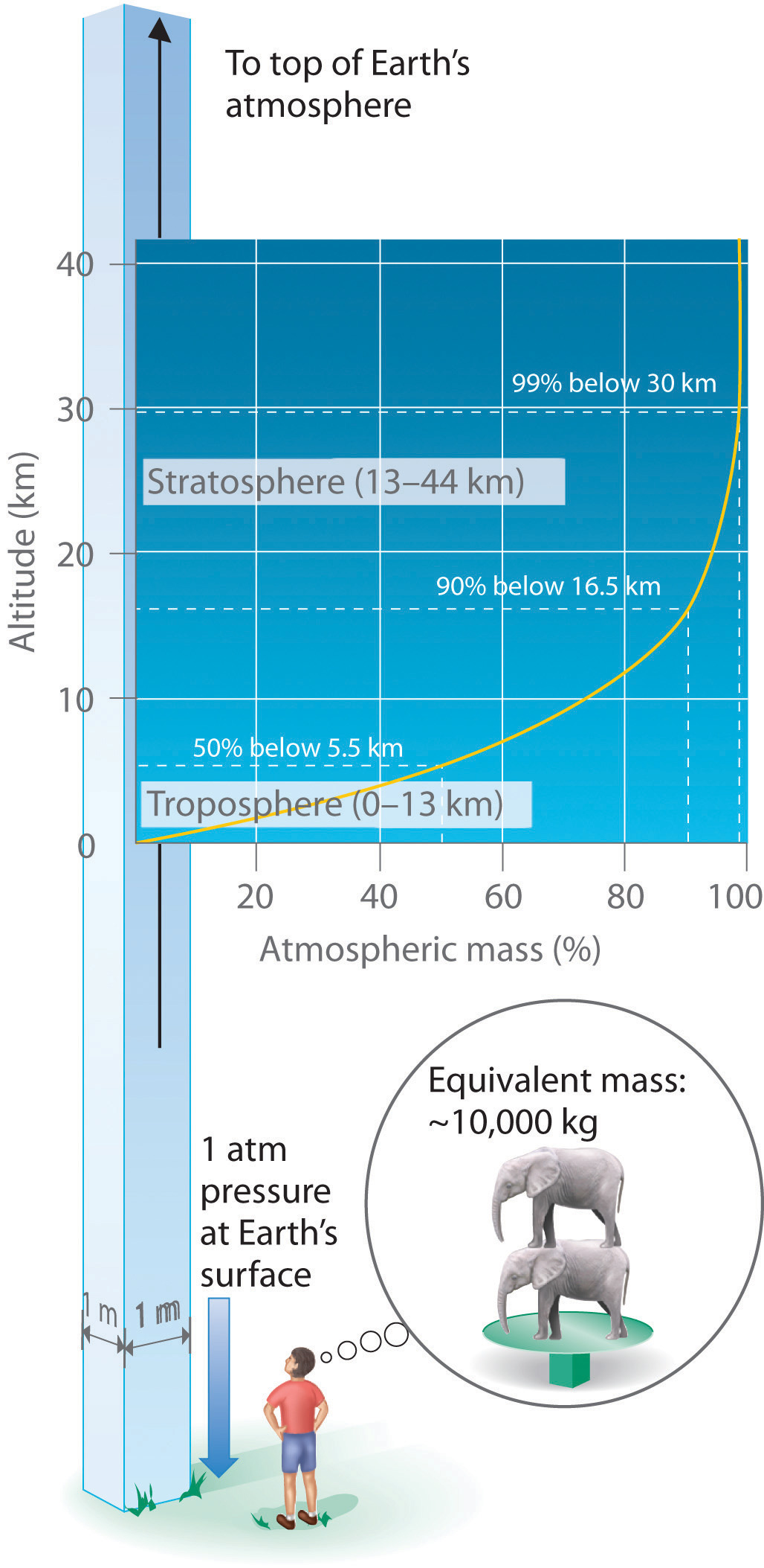 Just as we exert pressure on a surface because of gravity, so does our atmosphere. We live at the bottom of an ocean of gases that becomes progressively less dense with increasing altitude. Approximately 99% of the mass of the atmosphere lies within 30 km of Earth’s surface, and half of it is within the first 5.5 km (Figure 10.3 "Atmospheric Pressure"). Every point on Earth’s surface experiences a net pressure called atmospheric pressure. The pressure exerted by the atmosphere is considerable: a 1.0 m2 column, measured from sea level to the top of the atmosphere, has a mass of about 10,000 kg, which gives a pressure of about 100 kPa: