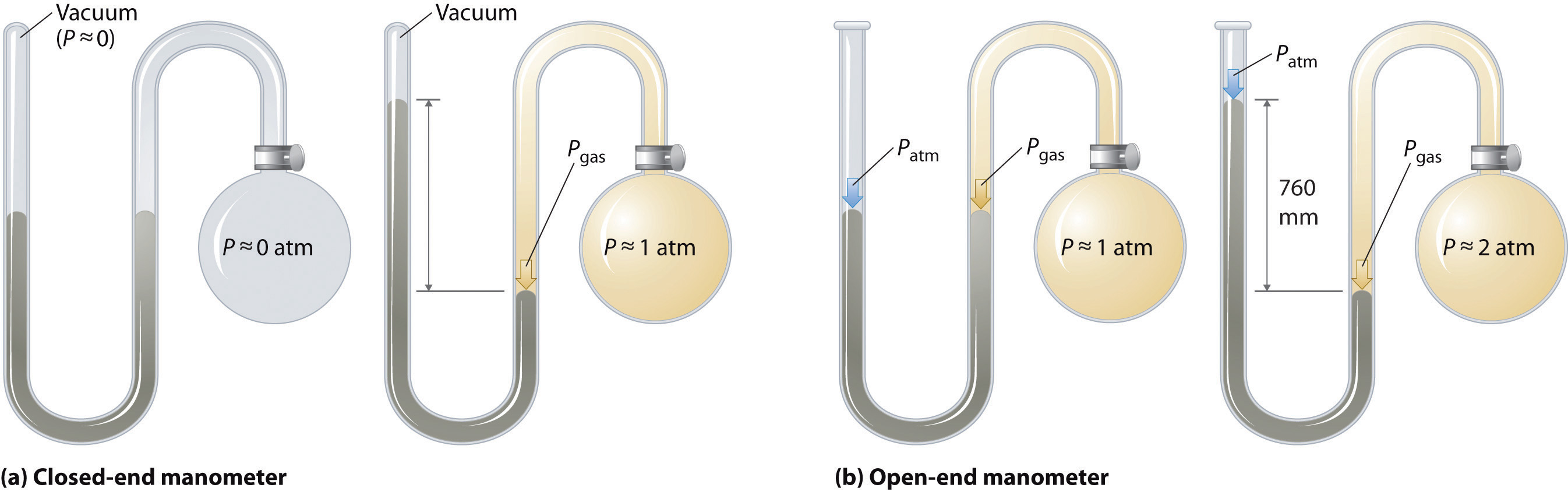 (a) In a closed-end manometer, the space above the mercury column on the left (the reference arm) is essentially a vacuum (P ≈ 0), and the difference in the heights of the two columns gives the pressure of the gas contained in the bulb directly. (b) In an open-end manometer, the left (reference) arm is open to the atmosphere (P ≈ 1 atm), and the difference in the heights of the two columns gives the difference between atmospheric pressure and the pressure of the gas in the bulb.