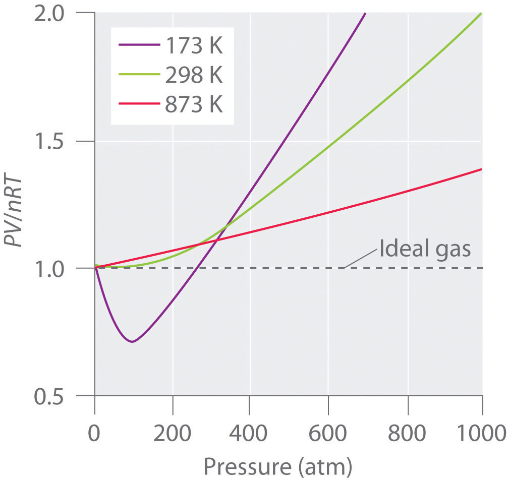 For an ideal gas, a plot of PV/nRT versus P gives a horizontal line with an intercept of 1 on the PV/nRT axis. Real gases, however, show significant deviations from the behavior expected for an ideal gas, particularly at high pressures (part (a) in Figure 10.21 "Real Gases Do Not Obey the Ideal Gas Law, Especially at High Pressures"). Only at relatively low pressures (less than 1 atm) do real gases approximate ideal gas behavior (part (b) in Figure 10.21 "Real Gases Do Not Obey the Ideal Gas Law, Especially at High Pressures"). Real gases also approach ideal gas behavior more closely at higher temperatures, as shown in Figure 10.22 "The Effect of Temperature on the Behavior of Real Gases" for N2. Why do real gases behave so differently from ideal gases at high pressures and low temperatures? Under these conditions, the two basic assumptions behind the ideal gas law—namely, that gas molecules have negligible volume and that intermolecular interactions are negligible—are no longer valid.