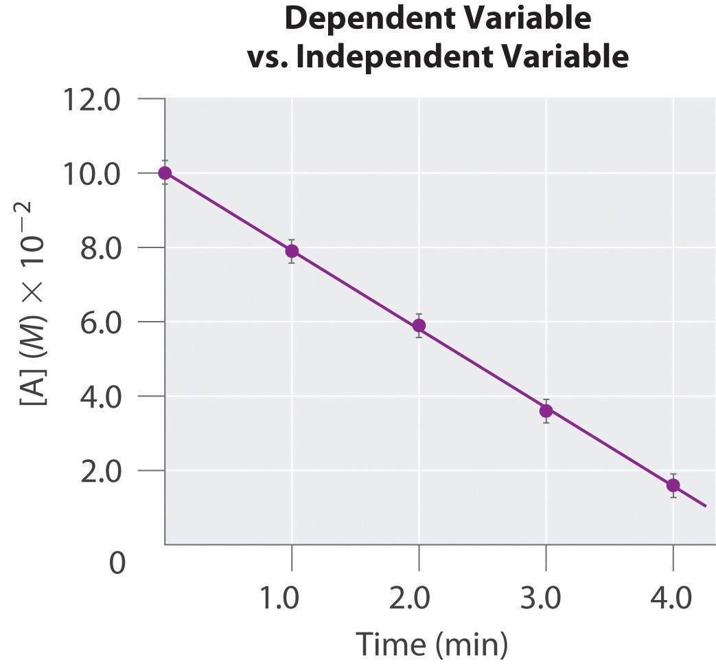 The independent variable is usually assigned to the horizontal, or x, axis (also called the abscissa), and the dependent variable to the vertical, or y, axis (called the ordinate). Let’s examine, for example, an experiment in which we are interested in plotting the change in the concentration of compound A with time. Because time does not depend on the concentration of A but the concentration of A does depend on the amount of time that has passed during the reaction, time is the independent variable and concentration is the dependent variable. In this case, the time is assigned to the horizontal axis and the concentration of A to the vertical axis.