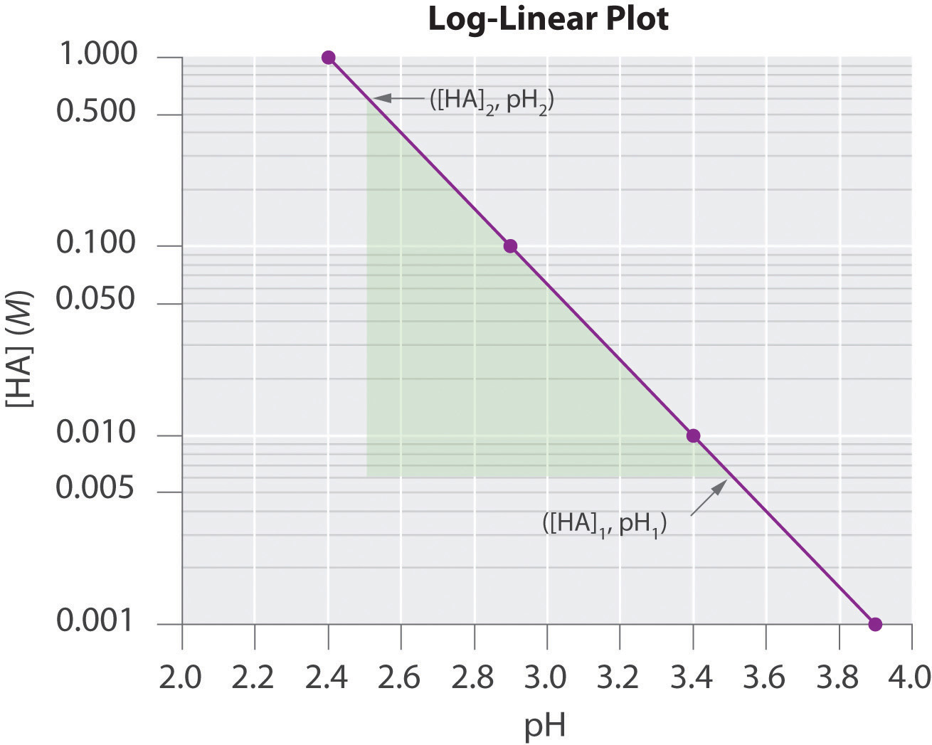 From the linear equation, a log-linear plot has a y-intercept of log A, so the value of A may be obtained directly from the plot if the x axis begins at 0 (in this case it does not, as is often the case in pH plots). Using our example, however, we can calculate [HA] at the y-intercept first by calculating the slope of the line using any two points and the equation