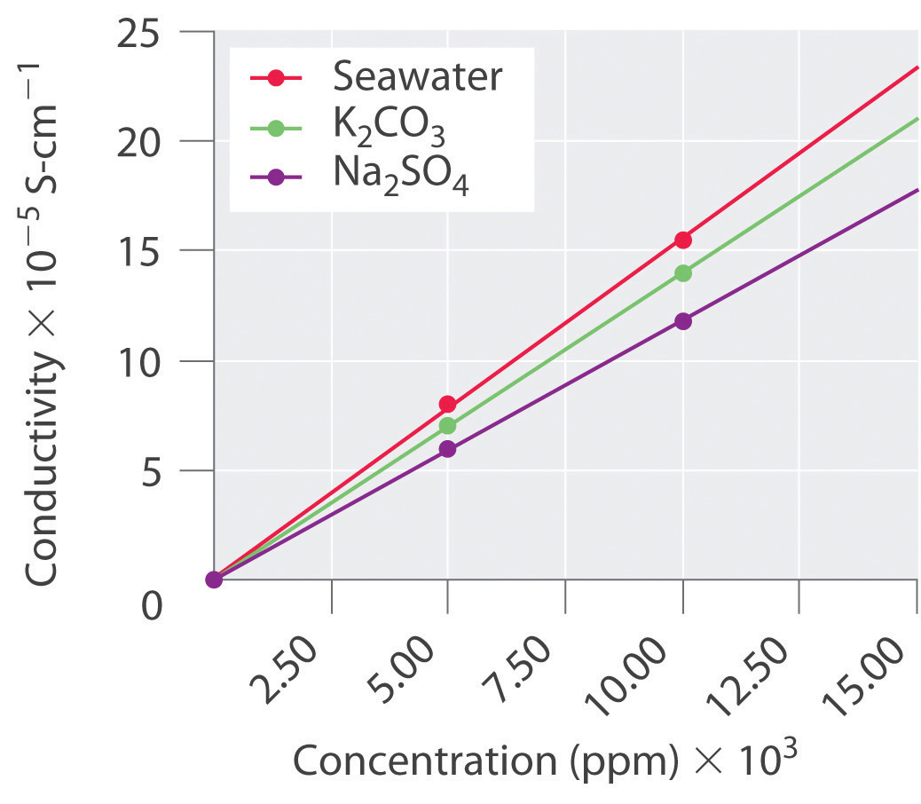Conductivity is the dependent variable, and concentration is the independent variable. From our graph, at 15.0 × 103 ppm, the conductivity of K2CO3 is predicted to be 21; that of seawater, 24; and that of Na2SO4, 18.