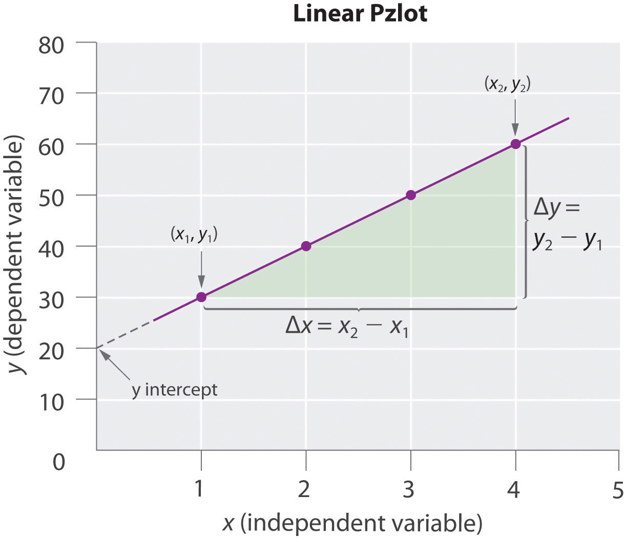 In a linear graph, the plot of the relationship between the variables is a straight line and thus can be expressed by the equation for a straight line: