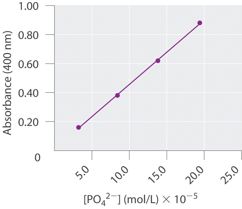 0.45 = (4.3 × 103)(x) + 0.00 x = 10 × 10−5This is in good agreement with a graphical determination of the phosphate concentration at an absorbance of 0.45, which gives a value of 10.2 × 10−5 mol/L.