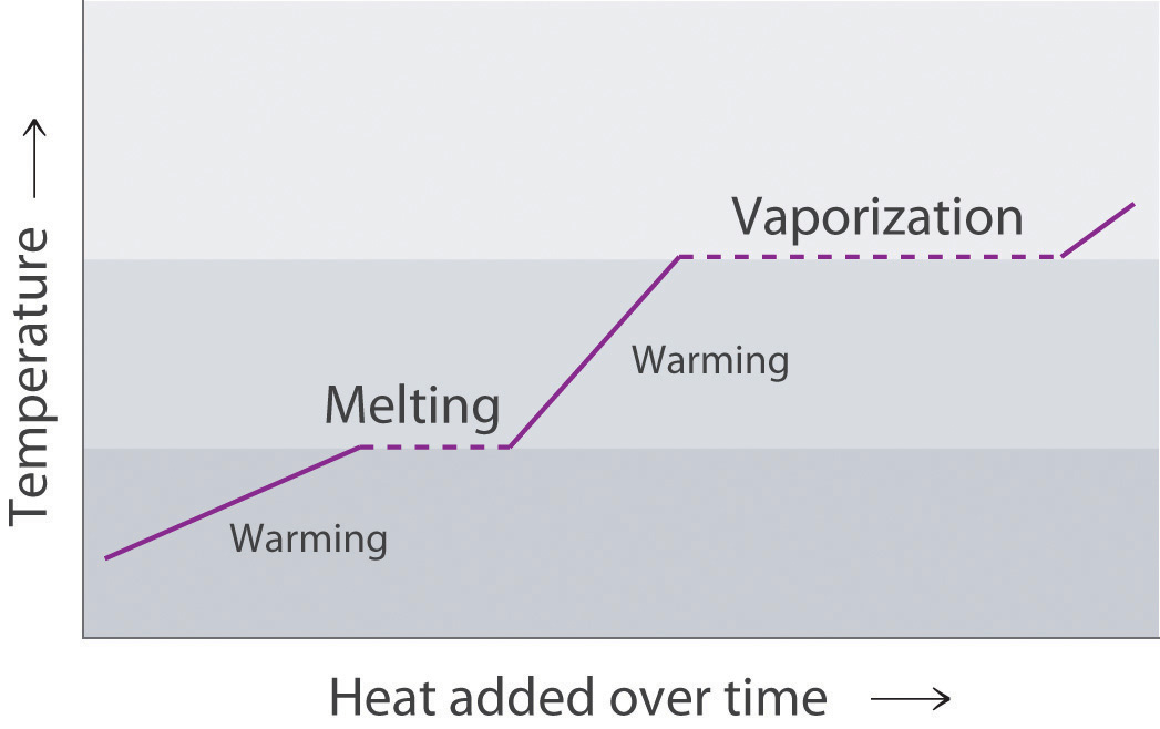 The portions of the curve with a positive slope correspond to heating a single phase, while the horizontal portions of the curve correspond to phase changes. During a phase change, the temperature of the system does not change, because the added heat is melting the solid at its melting point or evaporating the liquid at its boiling point.