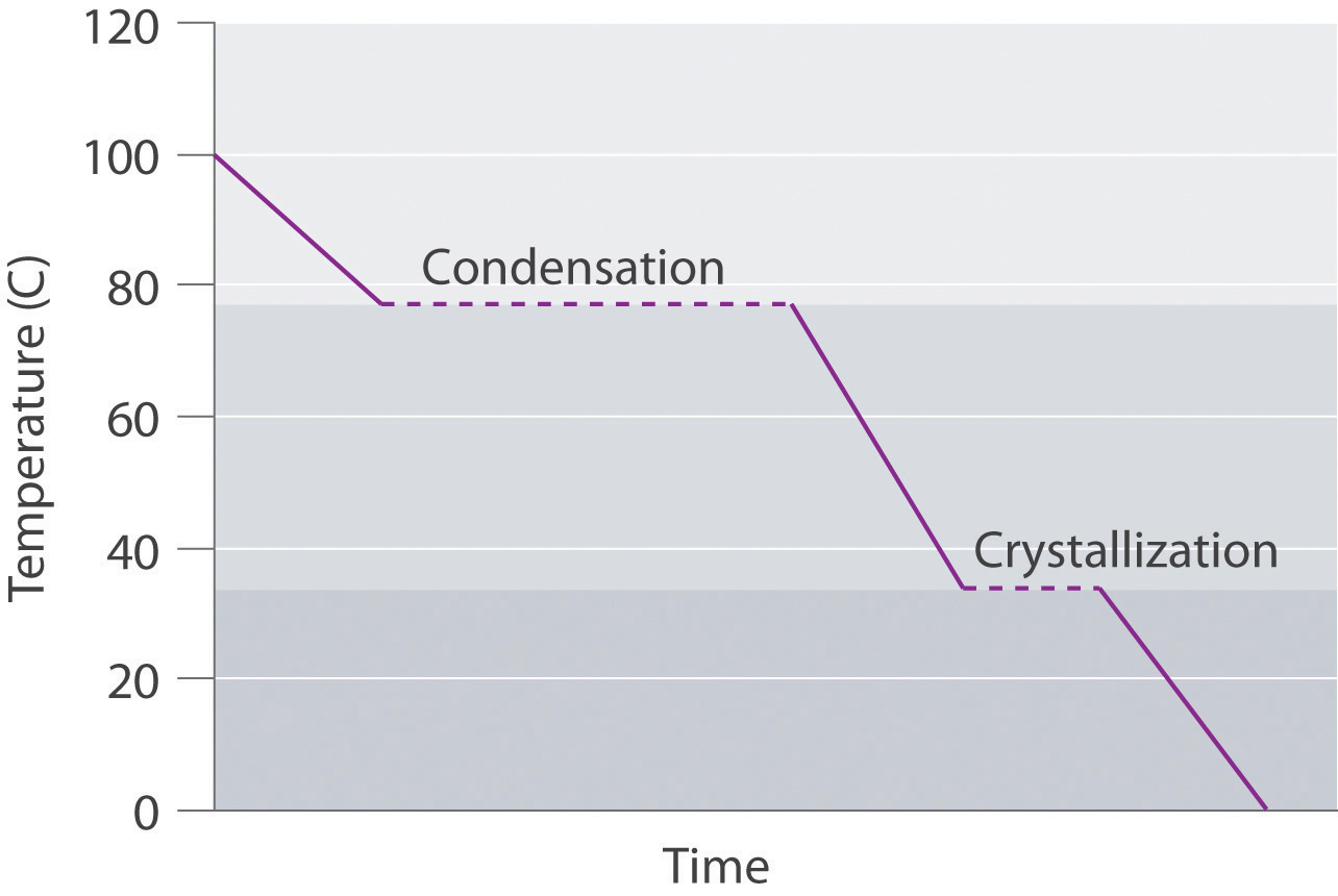 Draw the cooling curve for a sample of the vapor of a compound that has a melting point of 34°C and a boiling point of 77°C as it is cooled from 100°C to 0°C.