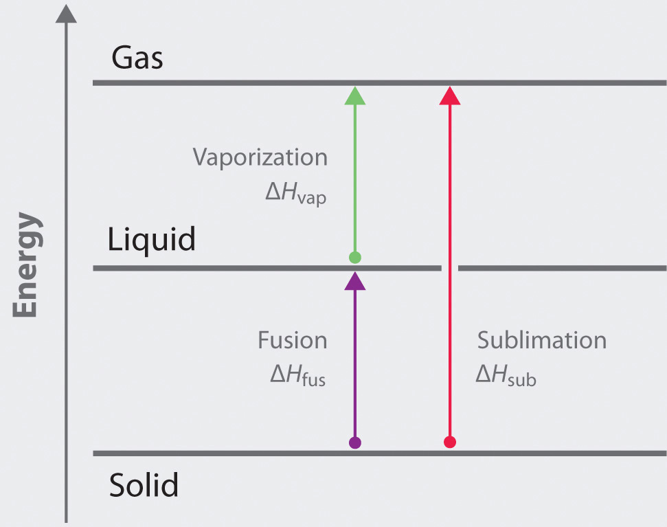 Changes of state are examples of phase changes, or phase transitions. All phase changes are accompanied by changes in the energy of a system. Changes from a more-ordered state to a less-ordered state (such as a liquid to a gas) are endothermic. Changes from a less-ordered state to a more-ordered state (such as a liquid to a solid) are always exothermic. The conversion of a solid to a liquid is called fusion (or melting). The energy required to melt 1 mol of a substance is its enthalpy of fusion (ΔHfus). The energy change required to vaporize 1 mol of a substance is the enthalpy of vaporization (ΔHvap). The direct conversion of a solid to a gas is sublimation. The amount of energy needed to sublime 1 mol of a substance is its enthalpy of sublimation (ΔHsub) and is the sum of the enthalpies of fusion and vaporization. Plots of the temperature of a substance versus heat added or versus heating time at a constant rate of heating are called heating curves. Heating curves relate temperature changes to phase transitions. A superheated liquid, a liquid at a temperature and pressure at which it should be a gas, is not stable. A cooling curve is not exactly the reverse of the heating curve because many liquids do not freeze at the expected temperature. Instead, they form a supercooled liquid, a metastable liquid phase that exists below the normal melting point. Supercooled liquids usually crystallize on standing, or adding a seed crystal of the same or another substance can induce crystallization.