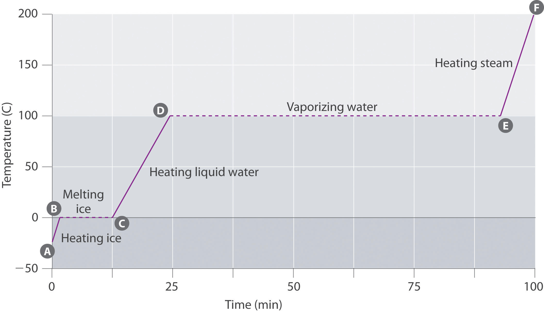 This plot of temperature shows what happens to a 75 g sample of ice initially at 1 atm and −23°C as heat is added at a constant rate: A–B: heating solid ice; B–C: melting ice; C–D: heating liquid water; D–E: vaporizing water; E–F: heating steam.
