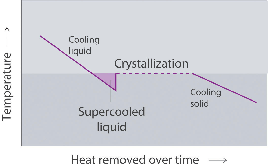 Conversely, a supercooled liquid exists temporarily as a liquid with a temperature lower than the normal melting point of the solid. As shown below, when a supercooled liquid crystallizes, the temperature increases as the liquid is converted to a solid.