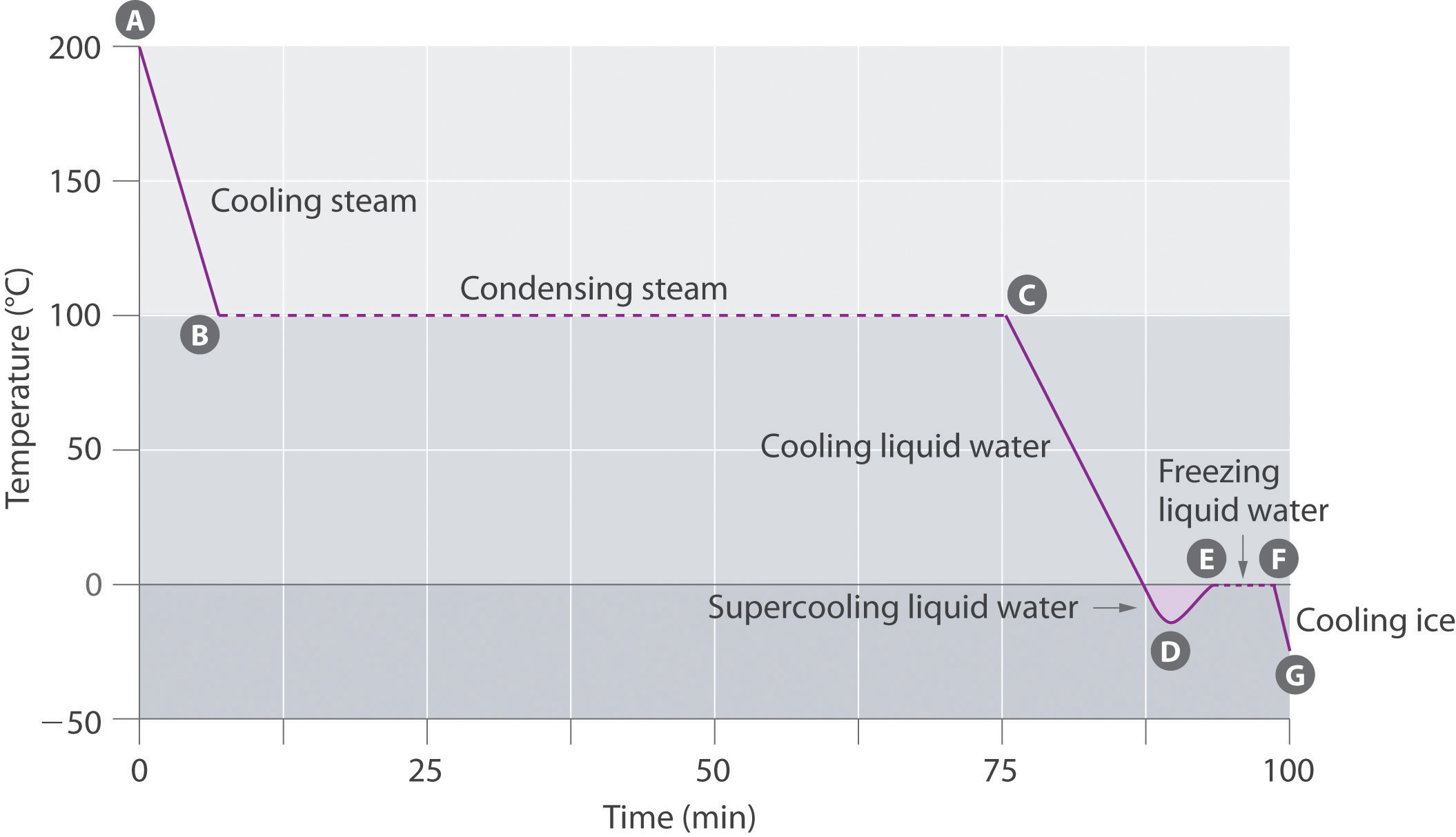 This plot of temperature shows what happens to a 75 g sample of steam initially at 1 atm and 200°C as heat is removed at a constant rate: A–B: cooling steam; B–C: condensing steam; C–D: cooling liquid water to give a supercooled liquid; D–E: warming the liquid as it begins to freeze; E–F: freezing liquid water; F–G: cooling ice.