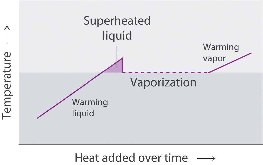 A superheated liquidAn unstable liquid at a temperature and pressure at which it should be a gas. is a sample of a liquid at the temperature and pressure at which it should be a gas. Superheated liquids are not stable; the liquid will eventually boil, sometimes violently. The phenomenon of superheating causes “bumping” when a liquid is heated in the laboratory. When a test tube containing water is heated over a Bunsen burner, for example, one portion of the liquid can easily become too hot. When the superheated liquid converts to a gas, it can push or “bump” the rest of the liquid out of the test tube. Placing a stirring rod or a small piece of ceramic (a “boiling chip”) in the test tube allows bubbles of vapor to form on the surface of the object so the liquid boils instead of becoming superheated. Superheating is the reason a liquid heated in a smooth cup in a microwave oven may not boil until the cup is moved, when the motion of the cup allows bubbles to form.