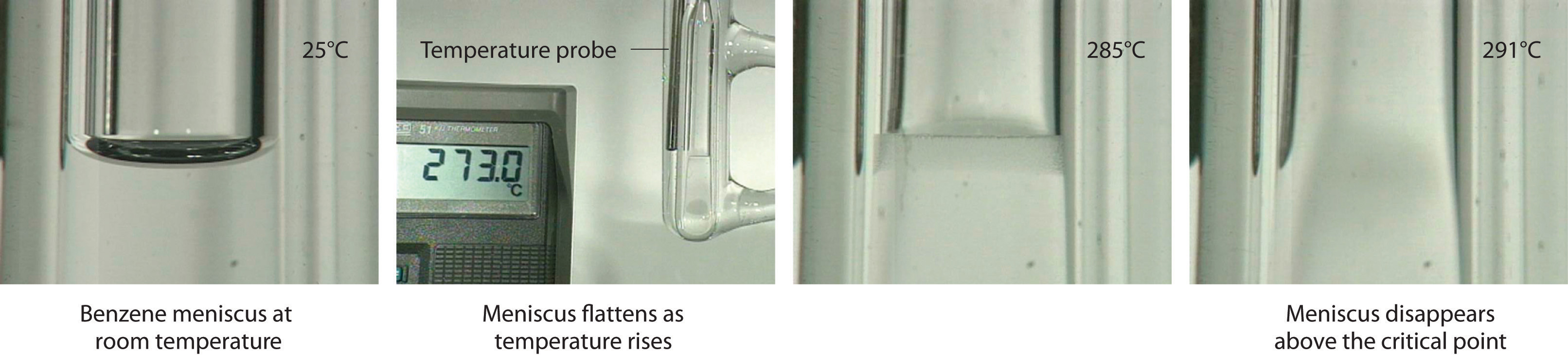 Below the critical temperature of benzene (Tc = 289°C), the meniscus between the liquid and gas phases is apparent. At the critical temperature, the meniscus disappears because the density of the vapor is equal to the density of the liquid. Above Tc, a dense homogeneous fluid fills the tube.