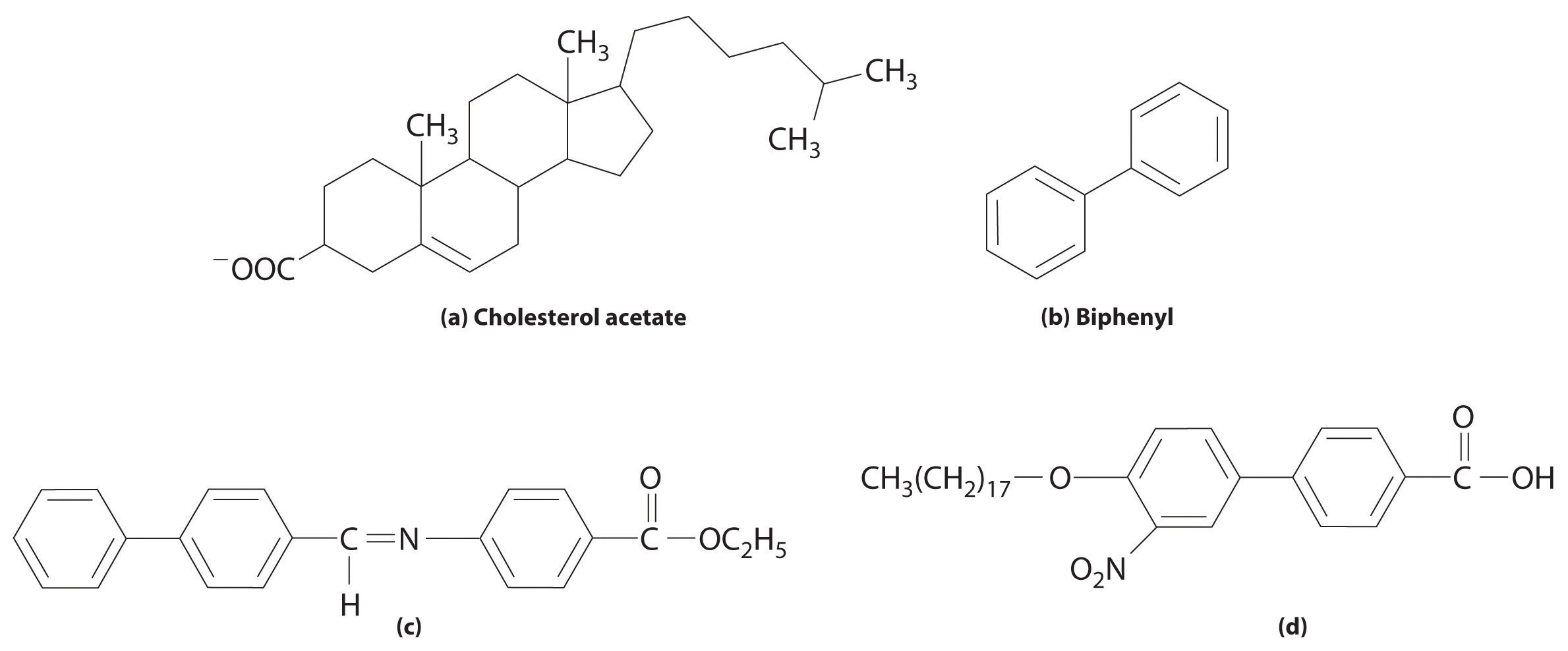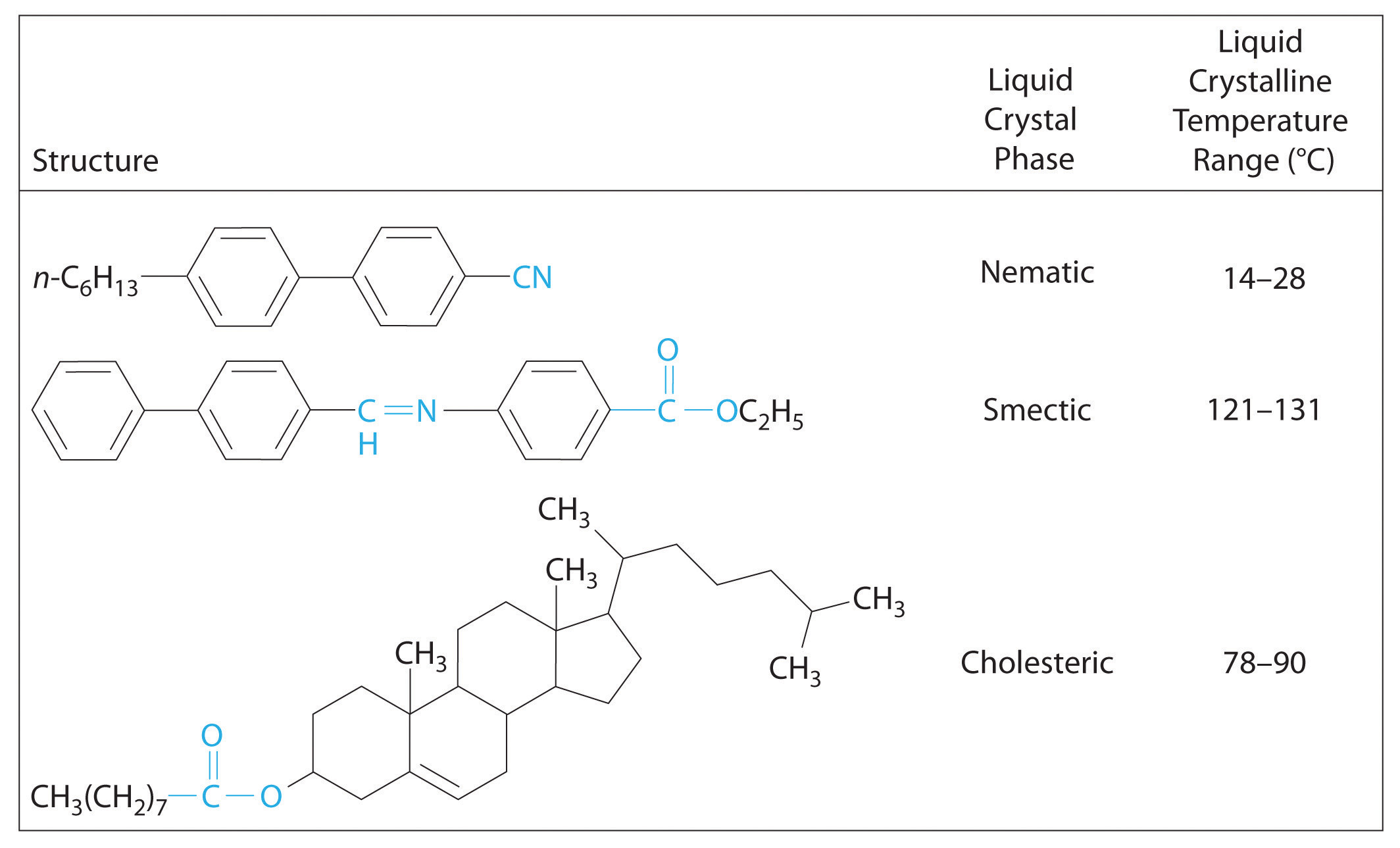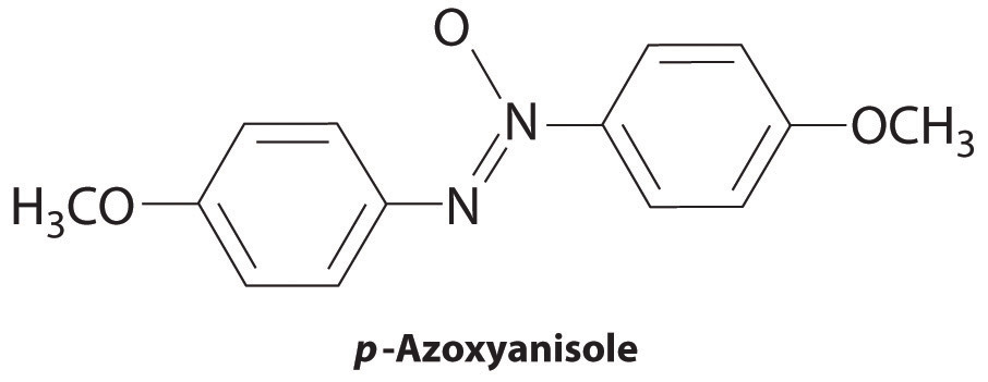 Molecules that form liquid crystals tend to be rigid molecules with polar groups that exhibit relatively strong dipole–dipole or dipole–induced dipole interactions, hydrogen bonds, or some combination of both. Some examples of substances that form liquid crystals are listed in Figure 11.27 "Structures of Typical Molecules That Form Liquid Crystals*" along with their characteristic phase transition temperature ranges. In most cases, the intermolecular interactions are due to the presence of polar or polarizable groups. Aromatic rings and multiple bonds between carbon and nitrogen or oxygen are especially common. Moreover, many liquid crystals are composed of molecules with two similar halves connected by a unit having a multiple bond.