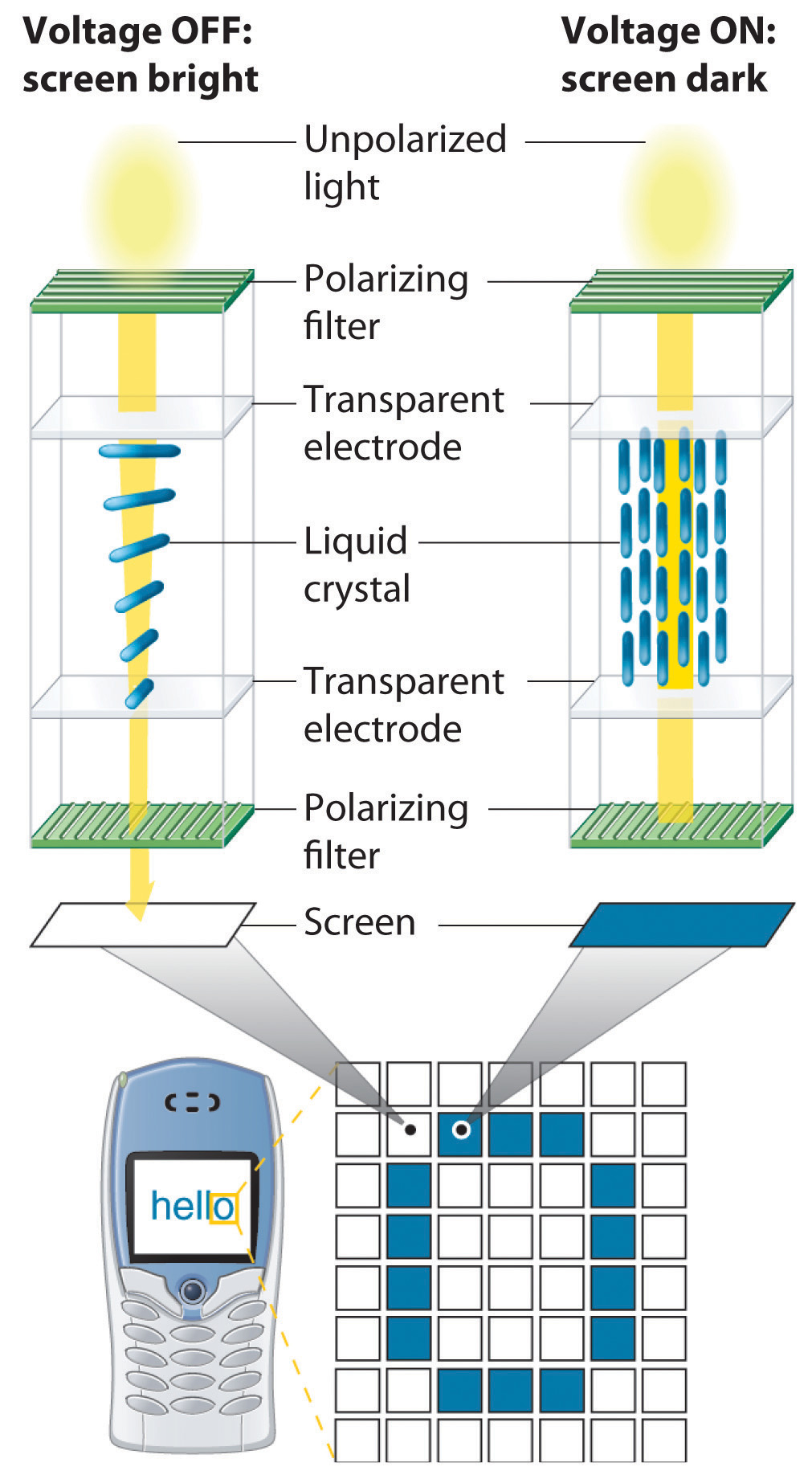 Applying a voltage to selected segments of the device will produce any of the numbers. The device is a sandwich that contains several very thin layers, consisting of (from top to bottom) a sheet of polarizer to produce polarized light, a transparent electrode, a thin layer of a liquid crystalline substance, a second transparent electrode, a second polarizer, and a screen. Applying an electrical voltage to the liquid crystal changes its orientation slightly, which rotates the plane of the polarized light and makes the area appear dark.