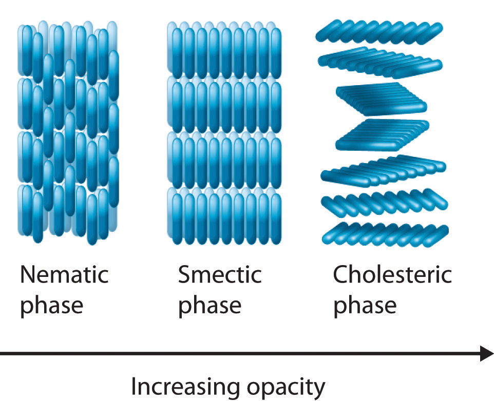 Most substances that exhibit the properties of liquid crystals consist of long, rigid rod- or disk-shaped molecules that are easily polarizable and can orient themselves in one of three different ways, as shown in Figure 11.26 "The Arrangement of Molecules in the Nematic, Smectic, and Cholesteric Liquid Crystal Phases". In the nematic phaseOne of three different ways that most liquid crystals can orient themselves. Only the long axes of the molecules are aligned, so they are free to rotate or to slide past one another., the molecules are not layered but are pointed in the same direction. As a result, the molecules are free to rotate or slide past one another. In the smectic phaseOne of three different ways that most liquid crystals can orient themselves. The long axes of the molecules are aligned (similar to the nematic phase), but the molecules are arranged in planes, too., the molecules maintain the general order of the nematic phase but are also aligned in layers. Several variants of the smectic phase are known, depending on the angle formed between the molecular axes and the planes of molecules. The simplest such structure is the so-called smectic A phase, in which the molecules can rotate about their long axes within a given plane, but they cannot readily slide past one another. In the cholesteric phaseOne of three different ways that most liquid crystals can orient themselves. The molecules are arranged in planes (similar to the smectic phase), but each layer is rotated by a certain amount with respect to those above and below it, giving it a helical structure., the molecules are directionally oriented and stacked in a helical pattern, with each layer rotated at a slight angle to the ones above and below it. As the degree of molecular ordering increases from the nematic phase to the cholesteric phase, the liquid becomes more opaque, although direct comparisons are somewhat difficult because most compounds form only one of these liquid crystal phases when the solid is melted or the liquid is cooled.