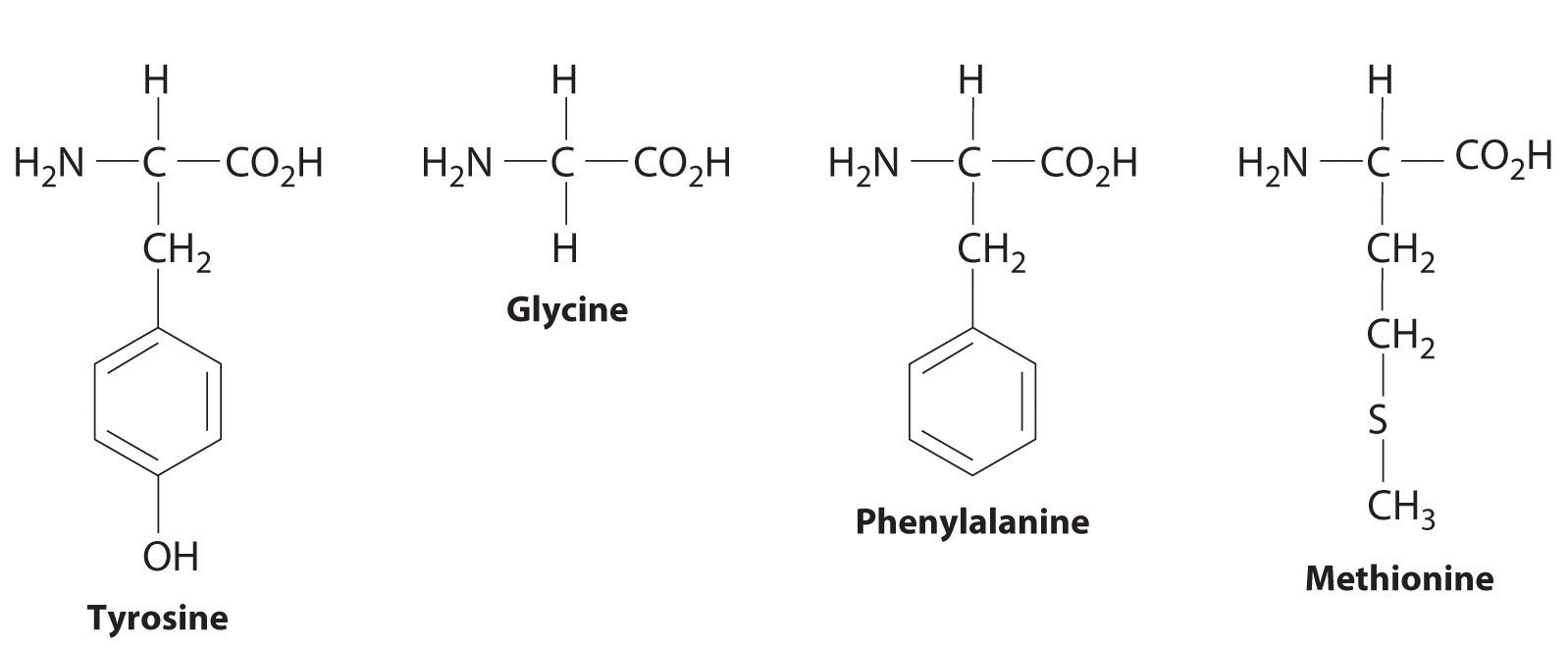 Enkephalins are pentapeptides, short biopolymers that are synthesized by humans to control pain. Enkephalins bind to certain receptors in brain cells, which are also known to bind morphine and heroin. One enkephalin has the structure tyrosine–glycine–glycine–phenylalanine–methionine. Draw its structure.