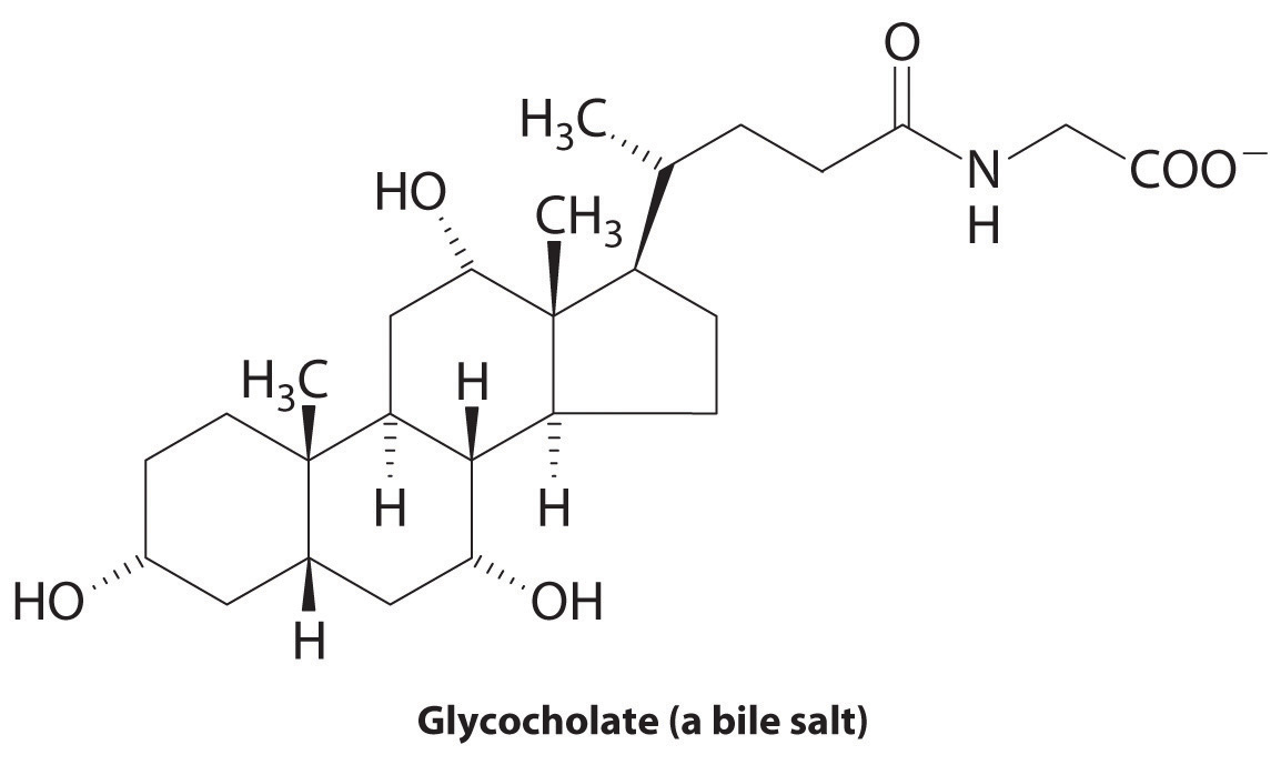 ♦ The liver secretes bile, which is essential for the digestion of fats. As discussed in Chapter 5 "Energy Changes in Chemical Reactions", fats are biomolecules with long hydrocarbon chains. The globules of fat released by partial digestion of food particles in the stomach and lower intestine are too large to be absorbed by the intestine unless they are emulsified by bile salts, such as glycocholate. Explain why a molecule like glycocholate is effective at creating an aqueous dispersion of fats in the digestive tract.