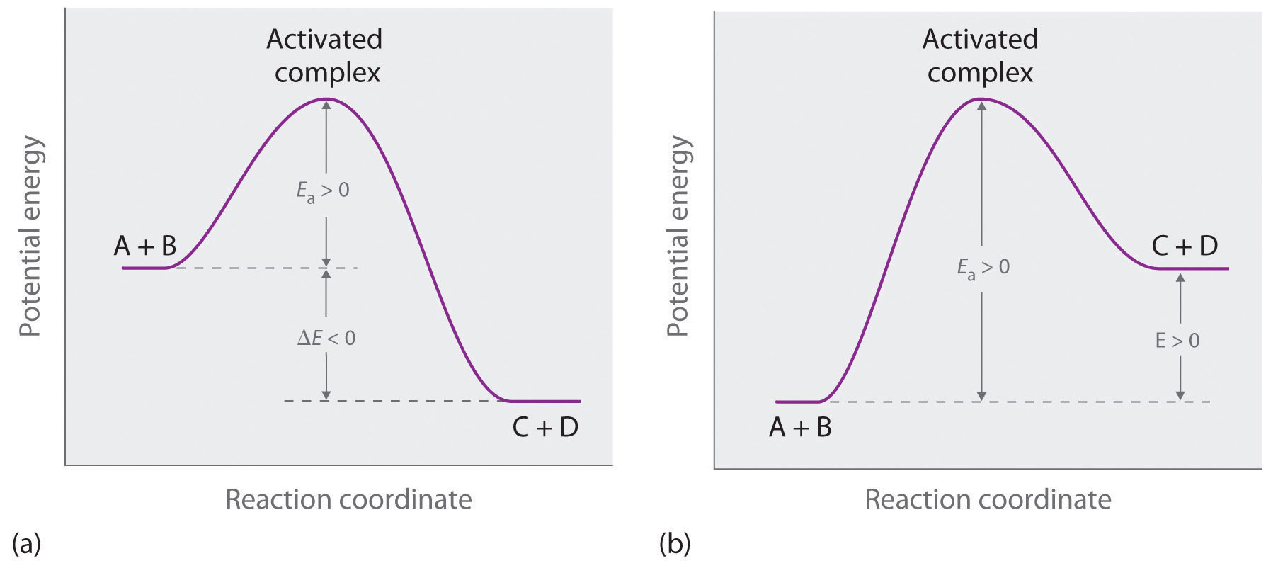The potential energy diagrams for a reaction with (a) ΔE < 0 and (b) ΔE > 0 illustrate the change in the potential energy of the system as reactants are converted to products. Ea is always positive. For a reaction such as the one shown in (b), Ea must be greater than ΔE.