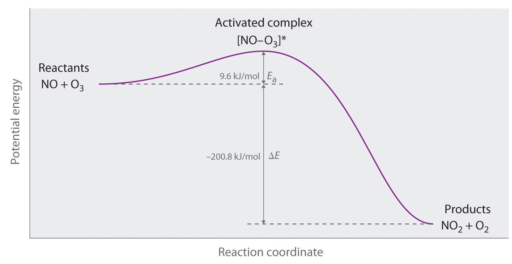 We can graph the energy of a reaction by plotting the potential energy of the system as the reaction progresses. Figure 14.21 "Energy of the Activated Complex for the NO–O" shows a plot for the NO–O3 system, in which the vertical axis is potential energy and the horizontal axis is the reaction coordinate, which indicates the progress of the reaction with time. The activated complex is shown in brackets with an asterisk. The overall change in potential energy for the reaction (ΔE) is negative, which means that the reaction releases energy. (In this case, ΔE is −200.8 kJ/mol.) To react, however, the molecules must overcome the energy barrier to reaction (Ea is 9.6 kJ/mol). That is, 9.6 kJ/mol must be put into the system as the activation energy. Below this threshold, the particles do not have enough energy for the reaction to occur.