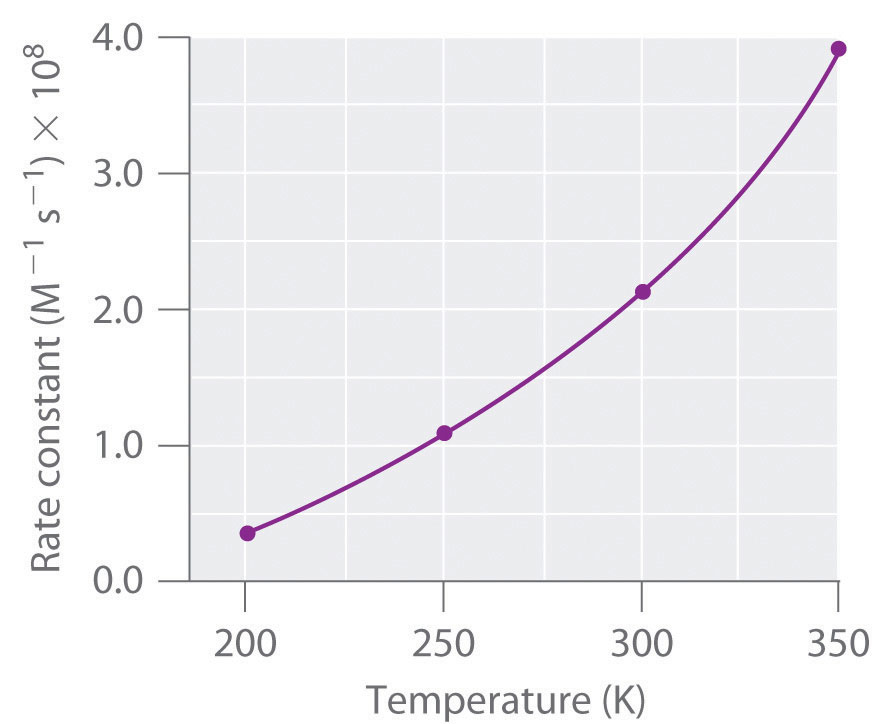 NO(g) + O3(g) → NO2(g) + O2(g)Increasing the temperature from 200 K to 350 K causes the rate constant for this particular reaction to increase by a factor of more than 10, whereas the increase in the frequency of bimolecular collisions over this temperature range is only 30%. Thus something other than an increase in the collision rate must be affecting the reaction rate.