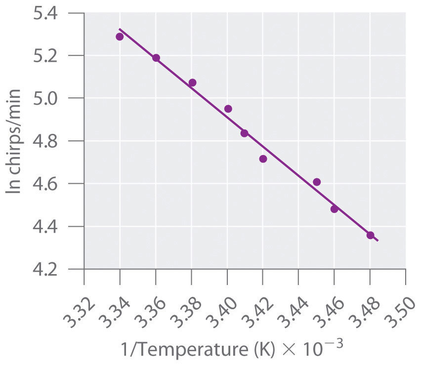 Many people believe that the rate of a tree cricket’s chirping is related to temperature. To see whether this is true, biologists have carried out accurate measurements of the rate of tree cricket chirping (f) as a function of temperature (T). Use the data in the following table, along with the graph of ln[chirping rate] versus 1/T in Figure 14.25 "Graphical Determination of ", to calculate Ea for the biochemical reaction that controls cricket chirping. Then predict the chirping rate on a very hot evening, when the temperature is 308 K (35°C, or 95°F).