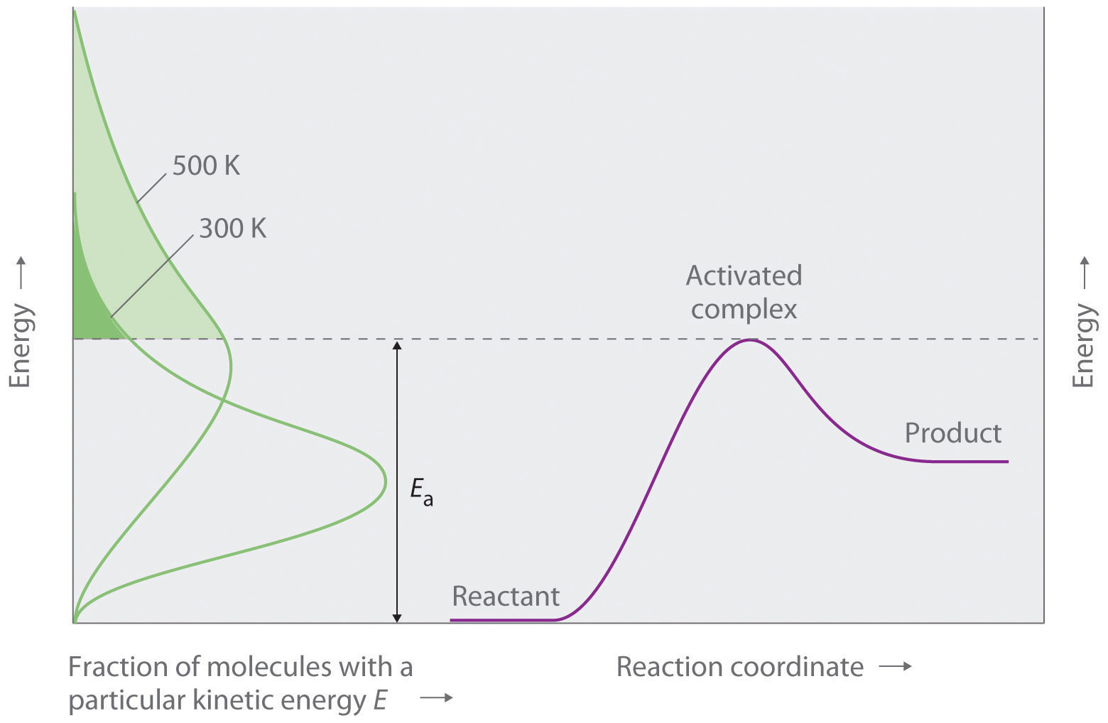Figure 14.24 "Surmounting the Energy Barrier to a Reaction" shows both the kinetic energy distributions and a potential energy diagram for a reaction. The shaded areas show that at the lower temperature (300 K), only a small fraction of molecules collide with kinetic energy greater than Ea; however, at the higher temperature (500 K) a much larger fraction of molecules collide with kinetic energy greater than Ea. Consequently, the reaction rate is much slower at the lower temperature because only a relatively few molecules collide with enough energy to overcome the potential energy barrier.
