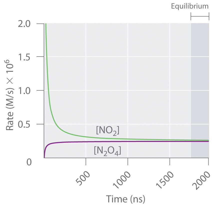 The rate of dimerization of NO2 (reverse reaction) decreases rapidly with time, as expected for a second-order reaction. Because the initial concentration of N2O4 is zero, the rate of the dissociation reaction (forward reaction) at t = 0 is also zero. As the dimerization reaction proceeds, the N2O4 concentration increases, and its rate of dissociation also increases. Eventually the rates of the two reactions are equal: chemical equilibrium has been reached, and the concentrations of N2O4 and NO2 no longer change.