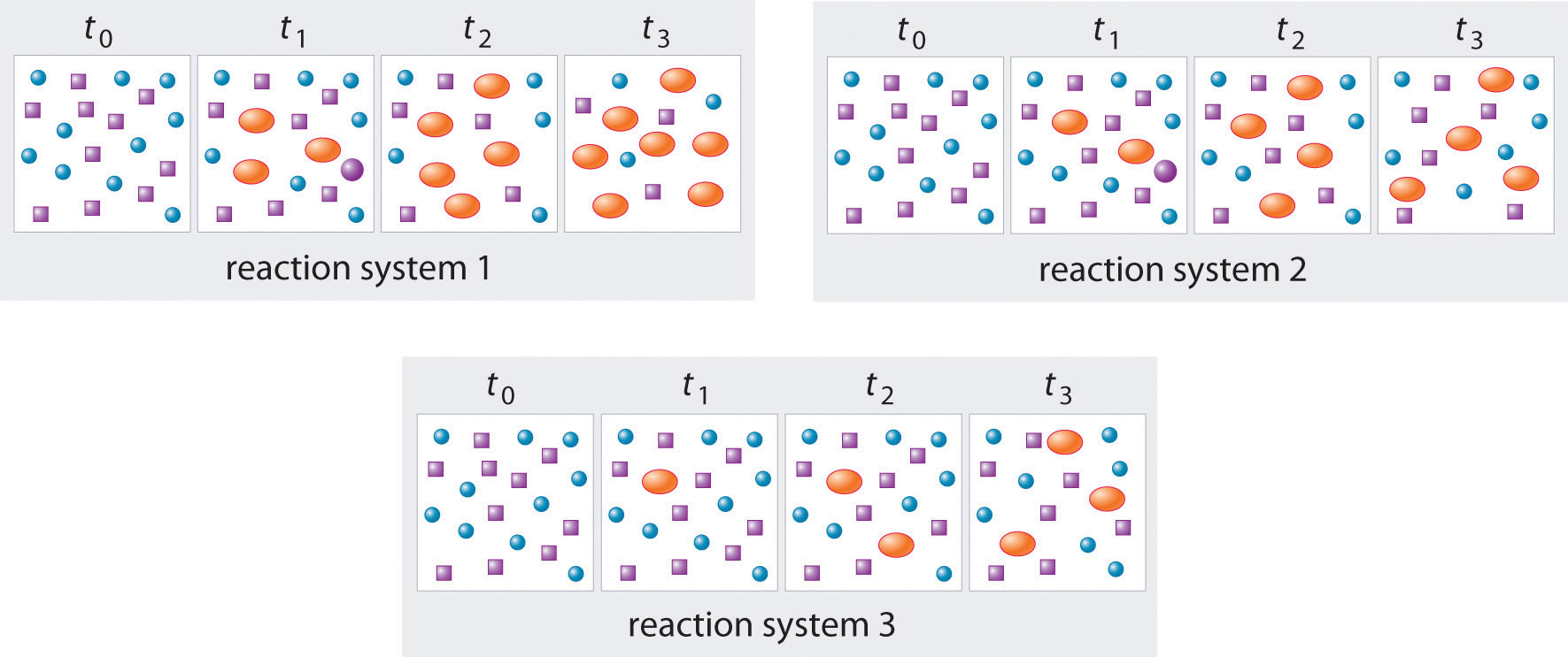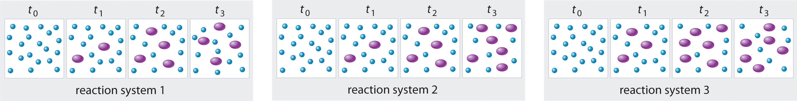 The three reaction systems (1, 2, and 3) depicted in the accompanying illustration can all be described by the equation where the blue circles are A and the purple ovals are B. Each set of panels shows the changing composition of one of the three reaction mixtures as a function of time. Which system took the longest to reach chemical equilibrium?