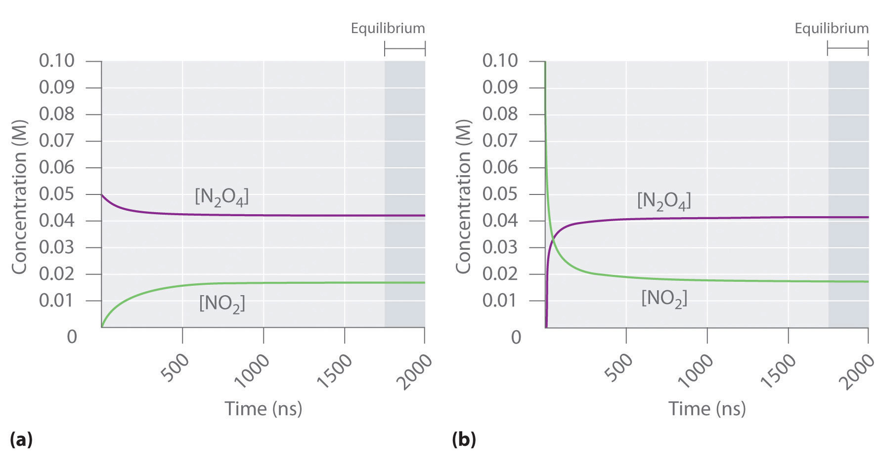 Figure 15.2 "The Composition of N" shows how the composition of this system would vary as a function of time at a constant temperature. If the initial concentration of NO2 were zero, then it increases as the concentration of N2O4 decreases. Eventually the composition of the system stops changing with time, and chemical equilibrium is achieved. Conversely, if we start with a sample that contains no N2O4 but an initial NO2 concentration twice the initial concentration of N2O4 in part (a) in Figure 15.2 "The Composition of N", in accordance with the stoichiometry of the reaction, we reach exactly the same equilibrium composition, as shown in part (b) in Figure 15.2 "The Composition of N". Thus equilibrium can be approached from either direction in a chemical reaction.