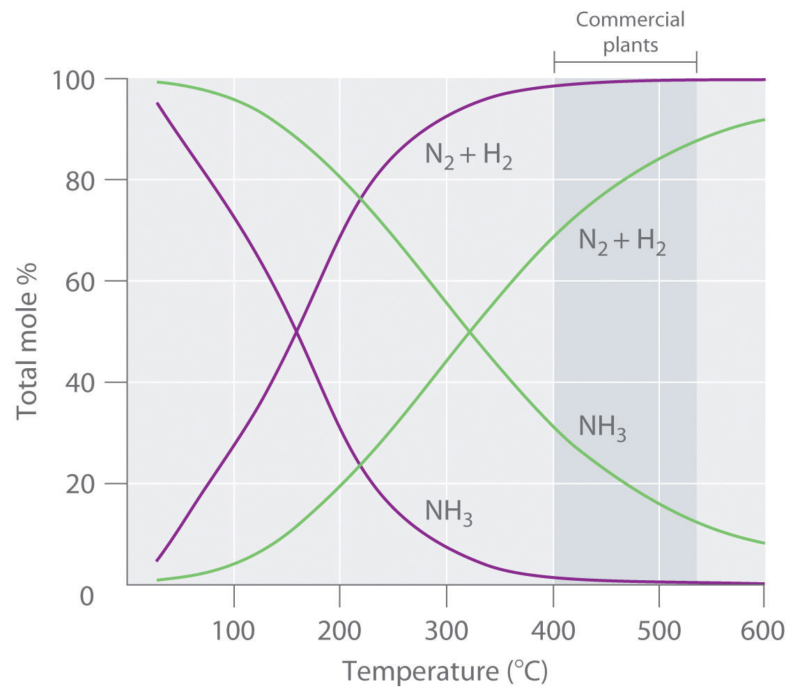 At all temperatures, the total pressure in the systems was initially either 4 atm (purple curves) or 200 atm (green curves). Note the dramatic decrease in the proportion of NH3 at equilibrium at higher temperatures in both cases, as well as the large increase in the proportion of NH3 at equilibrium at any temperature for the system at higher pressure (green) versus lower pressure (purple). Commercial plants that use the Haber-Bosch process to synthesize ammonia on an industrial scale operate at temperatures of 400°C–530°C (indicated by the darker gray band) and total pressures of 130–330 atm.